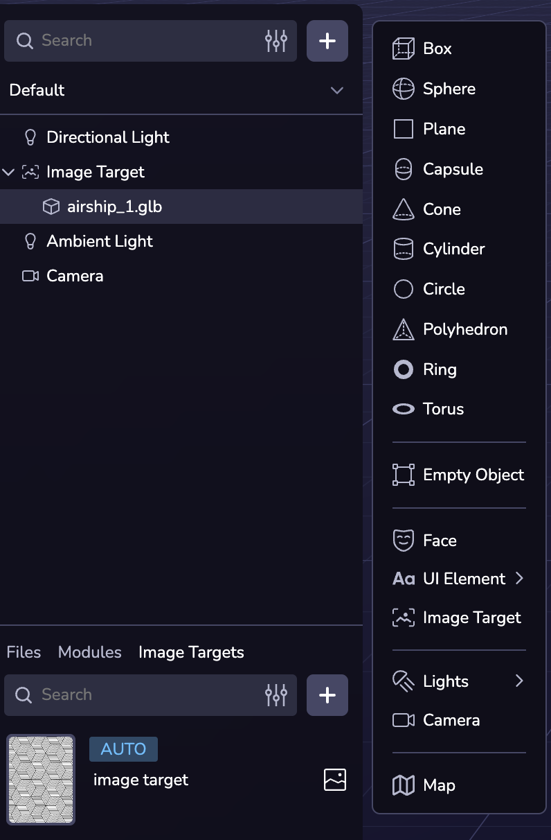 Locate the Image Targets panel at the bottom left of the Studio Interface. Click on the ( + ) to add a flat, cylindrical, or conical image target.